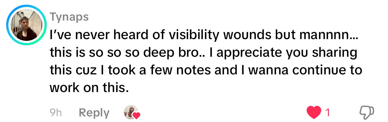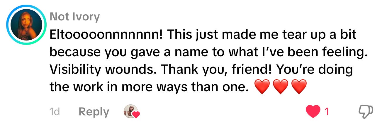 I haven't stopped thinking about visibility wounds since you mentioned them a few weeks ago. Whew, the ongoing and internal work that needs to be done as we all find our way through these content making streets on the way to higher ascension and newer versions of ourselves. Whew SMH LOL